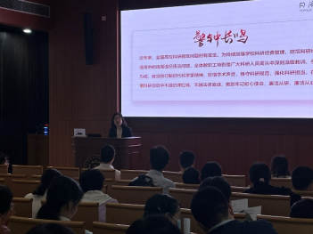 在开物馆A101报告厅开展科研诚信和经费使用警示教育暨师德失范(科研专项)案例学习。学习由副院长闵峻英主持,党委书记宋木生、纪委书记于颖、党委副书记郑彧豪、副院长高军等100余人参加。