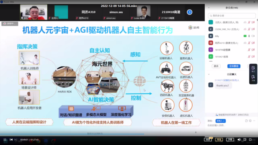 首先,王斌老师讲述人工智能和机器人的结合是可以为人类社会的问题提供一些解决方案。机器人可以在很多场景工作,可以帮助人类完成各种各样的工作,造福人类社会。