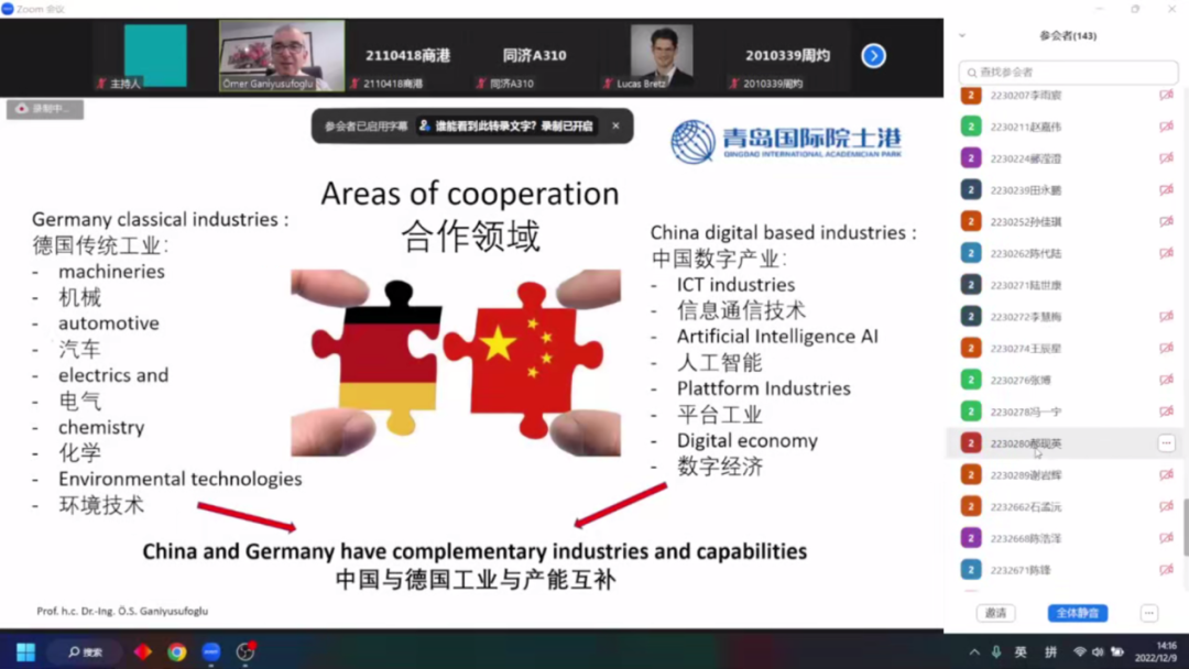 葛兴福教授提到,中国和德国的工业与产能领域互补,两国可实现合作共赢。德国在传统工业较中国更强,如机械、汽车、电气等;而中国的数字产业较德国更有优势,如信息通信技术、人工智能等。两国应该加强合作,实现共赢。最后,葛兴福教授说中德是“黄金搭档”,讲述他期望中德实现合作共赢的美好愿景,他希望德国未来能一直和中国做朋友。