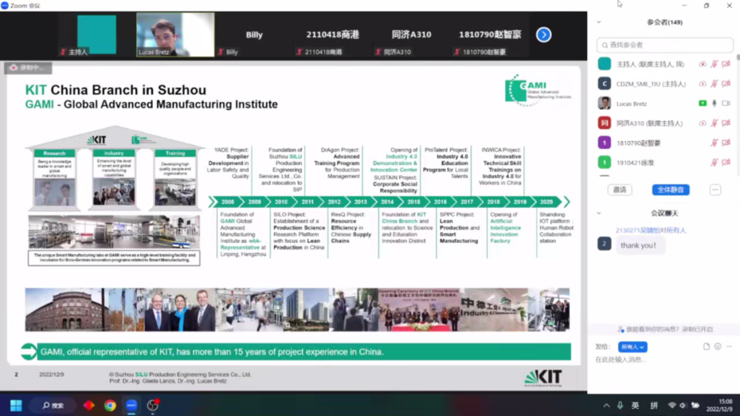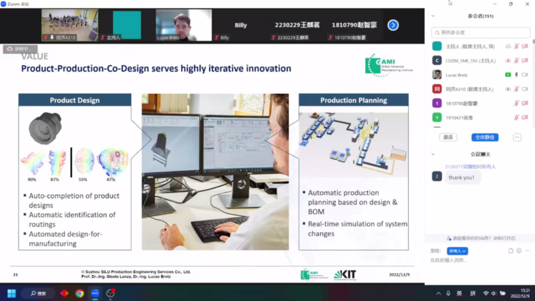 首先,Lucas Bretz博士介绍了KIT的苏州分公司——全球先进制造研究院。KIT和GAMI的智能制造实验室以应用为导向,进行培训和咨询。实验室包括工业4.0创新中心和人工智能创新工厂。