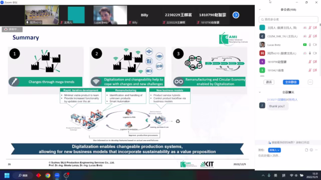 最后,Lucas Bretz博士总结,应该积极采用数字化应对变化和新挑战,通过大趋势的改变,数字化和多变性有助于应对变化和新挑战,并且数字化可以实现再制造和循环经济。
