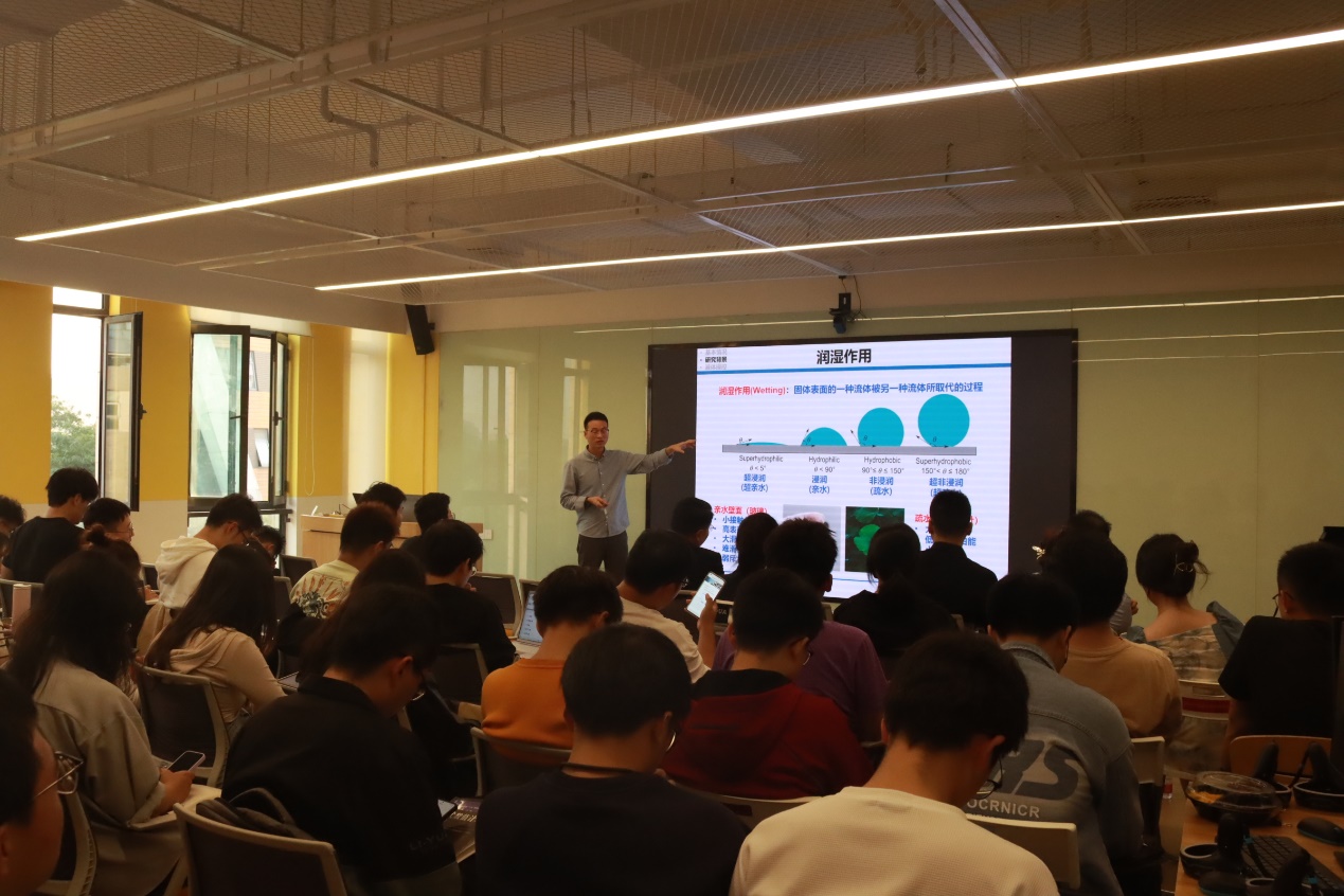 /中德机械工程中心-特聘研究员,博士生导师,Applied Sciences客座编辑。先后在中国矿业大学、同济大学和京都大学获得学士、硕士和博士学位,博士导师为Ryoichi Kurose教授和Mitsuhiro Matsumoto教授,2021年进入东京大学Junichiro Shiomi教授课题组从事博士后研究,之后在华为2012实验室-海光产品部从事高端精密设备的研发工作。主要研究方向为多尺度动态润湿、微流控、多相流固耦合数值计算、气液界面传质传热、两相流致振动等。本次论坛中袁志成博士的报告主题为“壁面润湿特性对液体行为的操控机制”。“出淤泥而不染,濯清涟而不妖”- 周敦颐的《爱莲说》中的这句诗,以莲的洁净和高雅比喻人的品格和行为。而实际上,这种自然现象也蕴含着深深的科学原理。雨水在荷叶表面自由滑动的现象,以及雨水在玻璃表面难以滑动的情况,都与固体表面的润湿特性有着密切的关系。袁志成博士以此为切入点,告诉同学们润湿是液体与固体表面之间相互作用的现象,这个现象会影响到液体的行为,比如在固体表面的附着、滚动、渗透等。固体表面的润湿特性对液体的行为具有调控作用,这为解决工业难题提供了新的思路。通过对表面润湿特性的研究,人们可以了解液体在不同固体表面上的行为特征,从而进行人为设计,特定地操控液体的行为。比如,改变固体表面的润湿特性,可以调控液体的附着、流动和扩散等行为,从而实现工业生产中的液体控制和分离等操作。对于流体机械、热能工程、力学等专业的学生来说,了解和研究固体表面的润湿特性具有重要的意义,这不仅有助于他们理解液体的行为和运动规律,也能为他们未来的学习和工作提供实用的知识和技能。