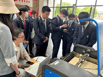 与人形机器人进行了亲密互动,体验了VR虚拟现实技术,观看了消防机器人的工作情况,动手制作了个性化的激光雕刻零件。活动最后,考入同济大学的曹杨二中学长们与二中学生分享了进入同济大学之后的各种心得体会。
