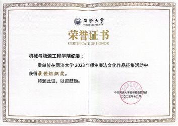 近日校纪委在四平校区图书馆一楼大厅举办“创清廉同济 扬新风正气”同济大学2023年廉洁文化作品展开幕暨颁奖式,我院纪委获评活动“最佳组织奖”。