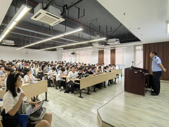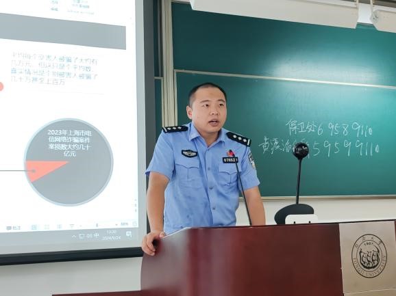 在上海市公安局嘉定分局、学校保卫处的支持下,反诈专班陆航警官为同学们开展了反诈宣传讲座。陆警官通过具体的诈骗案例和诈骗手段,向同学们讲解了如何正确地防范电信网络诈骗。