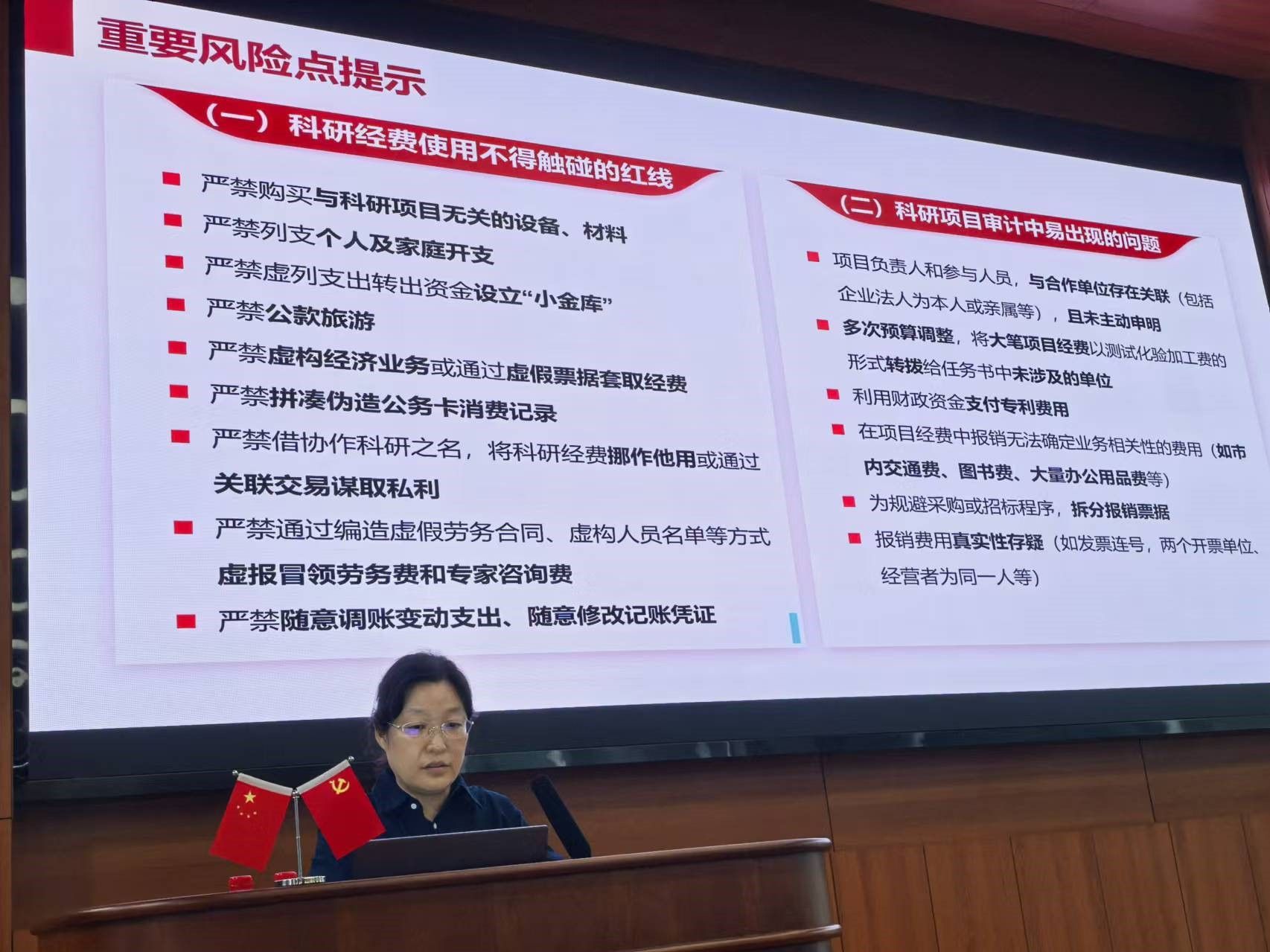 于颖在会上做了科研经费使用和科研诚信相关警示教育,结合具体案例提醒老师们要守牢底线,千万不要触碰红线。