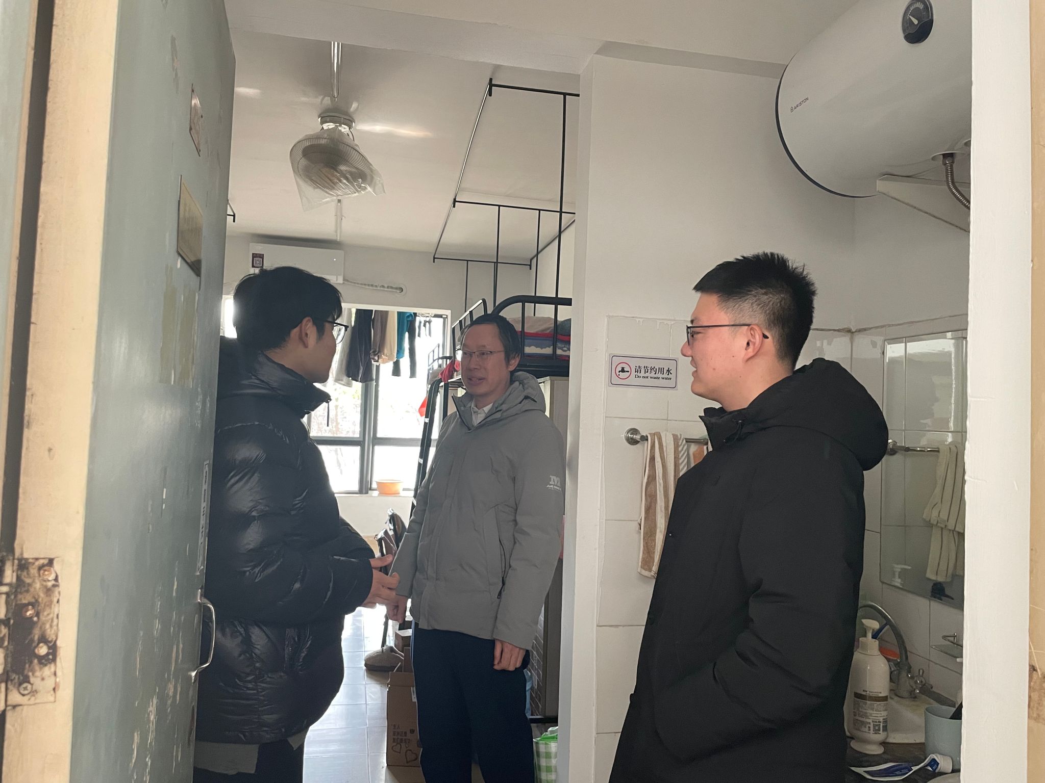 走访过程中,老师们与同学们亲切交谈,细致了解同学们学习生活情况,留校原因及生活需求等。宋木生老师亲切关怀每一位学生:了解家庭情况,是否有无生活、学习困难;叮嘱同学们寒假期间注意用电安全;保持与家人、朋友的联系,让家人放心。郑彧豪老师提醒同学们寒假期间合理安排学习与休息,注意劳逸结合;遇到任何问题随时与辅导员联系沟通。最后,为同学们送上新春祝福和新年大礼包。
