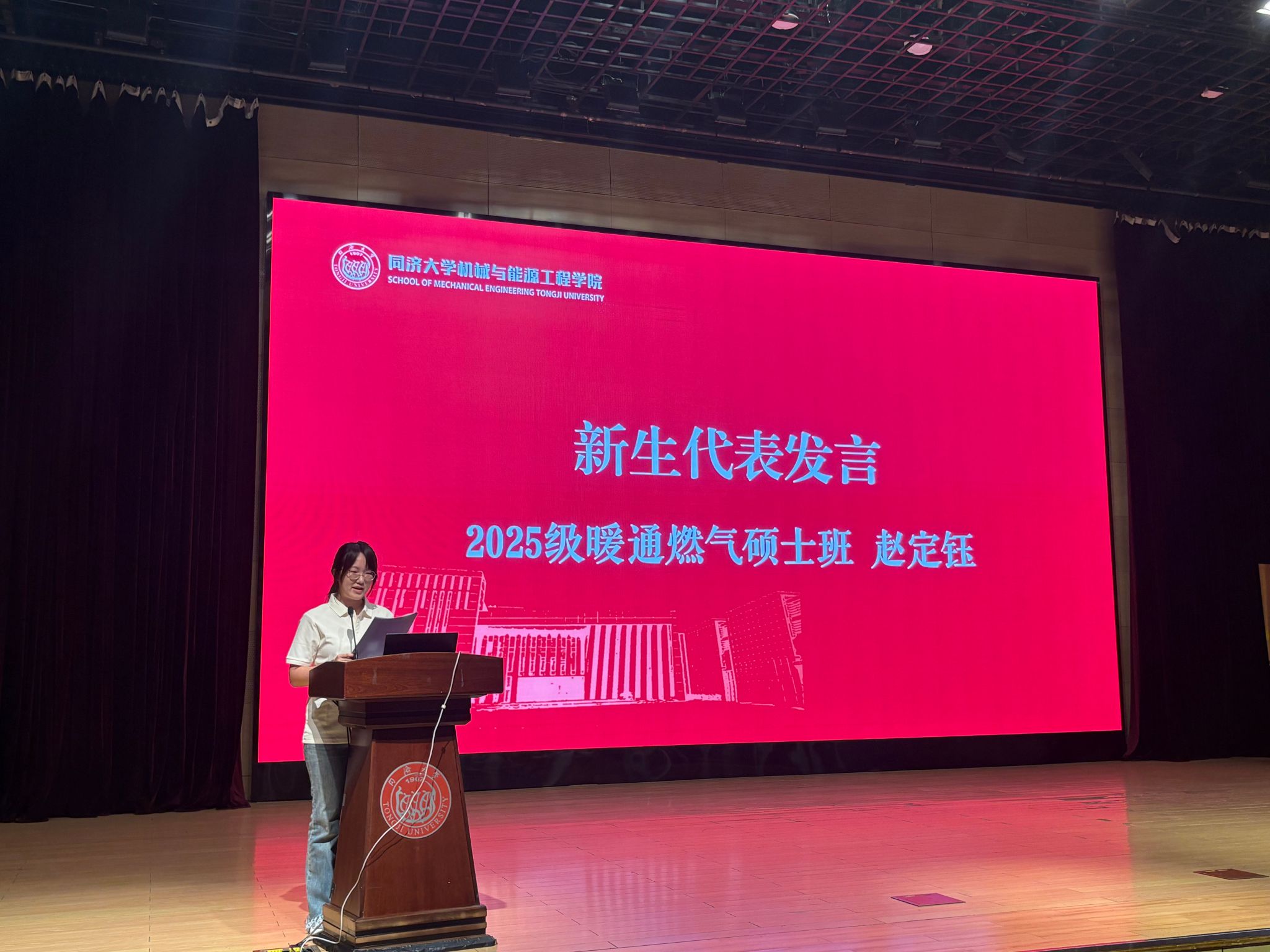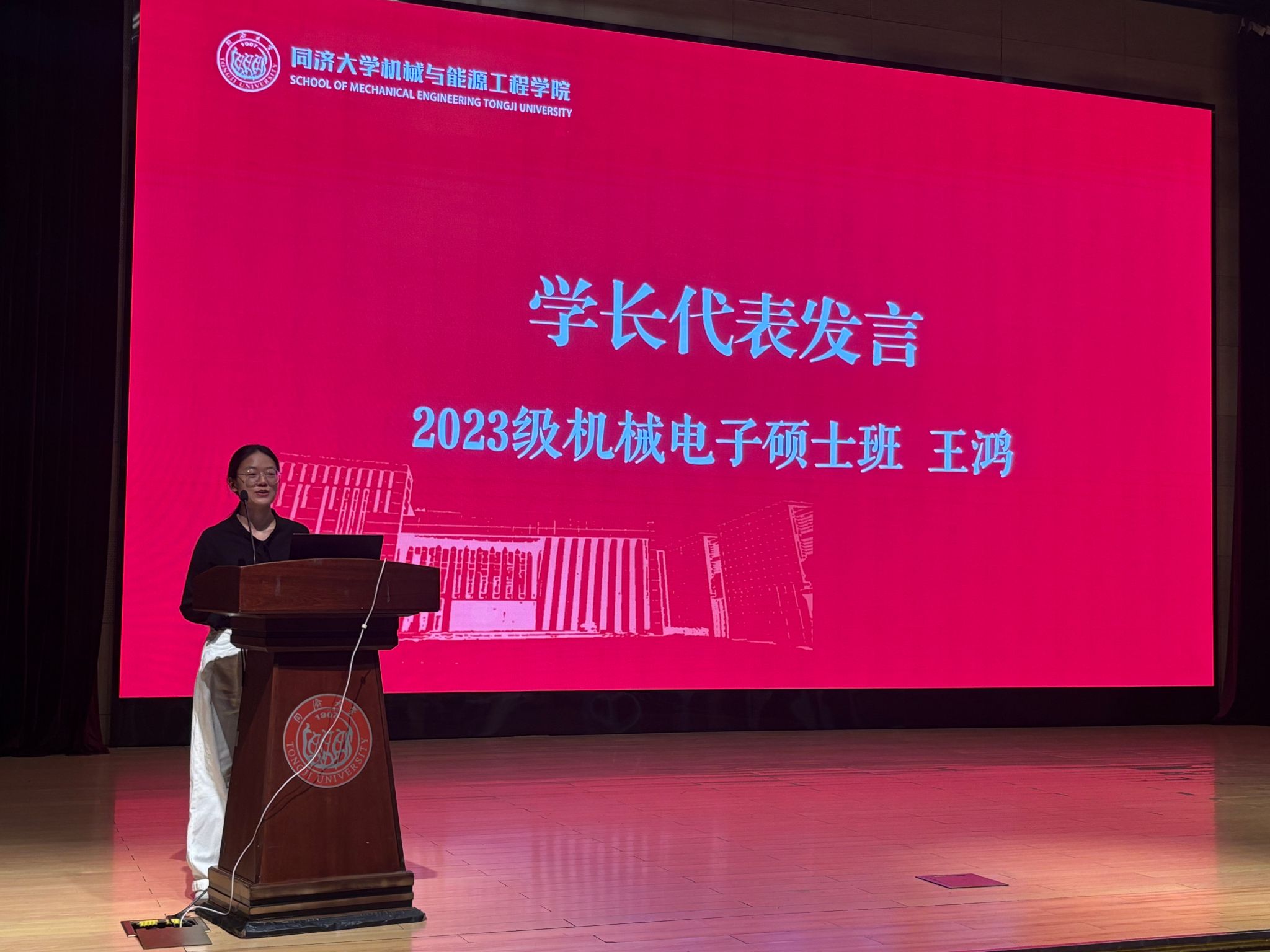 2023级机械电子硕士班王鸿作为学长代表,向学弟学妹们分享了自己研究生阶段科研生活中的体会与感悟。2025级暖通燃气硕士班赵定钰作为新生代表,表达了成为一名新同济人的自豪与喜悦,以及对即将到来的研究生阶段的思考。